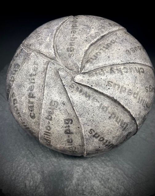 I grew up knowing them as Chuggie Pigs but perhaps you know them as Slaters, Woodlice, Carpenters or Rolly-Polys. One exhibition visitor called them Land Prawns! "Chuggie Pig" features 40 of the 250 regional names, all hand written onto the hand carved white marble jesmonite surface.